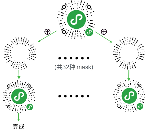 將小程序碼跟 32 種掩膜(又稱「mask」,可依照一定的規(guī)則生成)進(jìn)行異或運算,最終選取效果最佳的作為最終的小程序碼。